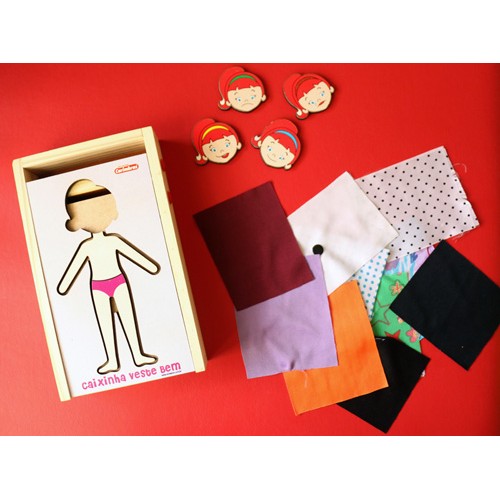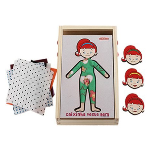 01 caixa de madeira ilustrada feminina, medindo 245mm x 145mm x 50mm, com 04 expressões de rosto para ser trocado conforme o vestuário e peças de tecidos com estampas variadas.