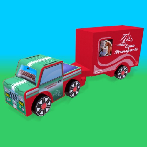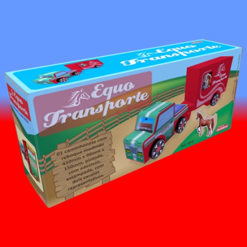 1 caminhonete com reboque medindo 410mm x 90mm x 150mm, pintada, com adesivos, estampada, com dois cavalos representativos.