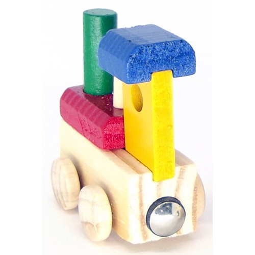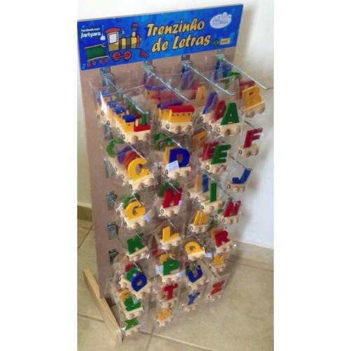 Uma Máquina Locomotiva, de madeira pintada, que possui ímãs na parte anterior e posterior, o que permite ligar vagões com outras letras ou com o vagão final, vendidos separadamente, para formar: nomes de crianças, palavras diversas, nomes de escolas, entre outros.