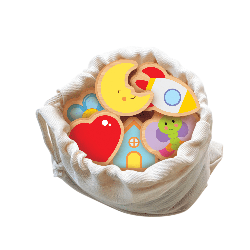 madeira para a criança encontrar no saquinho de tecido, sem olhar, e
