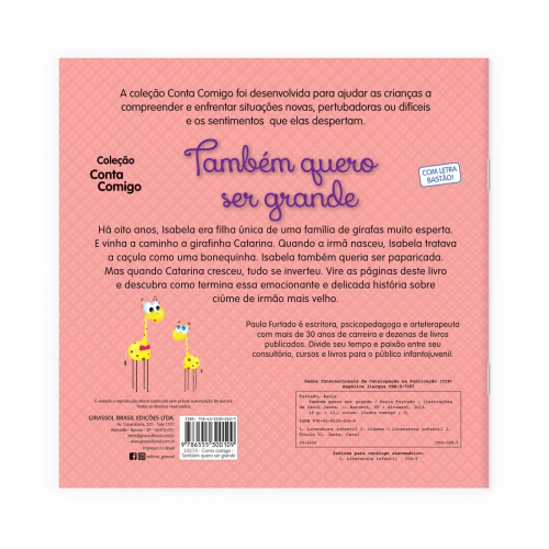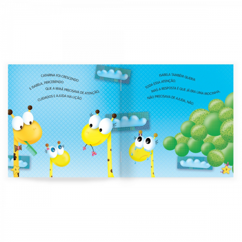 A coleção Conta Comigo foi desenvolvida para ajudar as crianças a compreender e enfrentar situações novas, perturbadoras ou difíceis e os sentimentos que elas despertam. Há oito anos, Isabela era filha única de uma família de girafas muito esperta. E vinha a caminho a girafinha Catarina. Quando a irmã nasceu, Isabela tratava a caçula como uma bonequinha. Isabela também queria ser paparicada. Mas quando Catarina cresceu, tudo se inverteu. Vire as páginas deste livro e descubra como termina essa emocionante e delicada história.