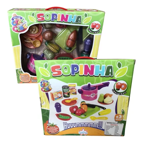 Brincadeira que tem comidinha de brinquedo, é mesmo uma delícia, com este kit você vai fazer uma sopinha super saborosa de faz de conta que dará até água na boca, as peças possuem um sistema de velcro que permite que os legumes possam ser cortadas ao meio, depois é só prender o velcro novamente e recomeçar a brincadeira.