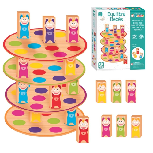 Caixa de atividade para a criança montar a torre mais alta, equilibrando os “bebês” nas cores sorteadas. Não vale deixar cair!