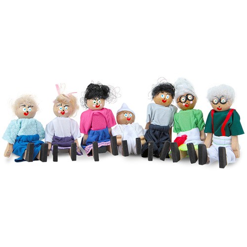 Bonecos de madeira e tecido de cores e estampas variadas, articulados, personalizados conforme característica e pintados com tinta a base d´água atóxica, composto por 7 personagens: Vovô, Vovó, Papai, Mamãe, Bebê, Menina e Menino.