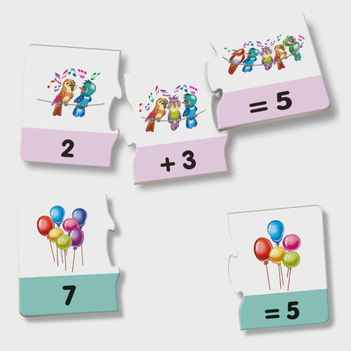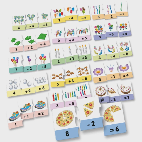 A crianças deve procurar as cartelas com imagens semelhantes e organizá-las de forma lógica para chegar ao resultado correto. As cartelas contêm imagens e sinais matemáticos que auxiliam na visualização das operações de adição e subtração.
