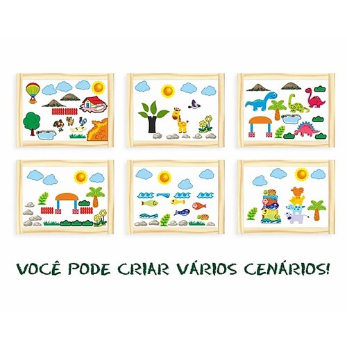 64 peças imantadas de tamanhos variados, decoradas, que servem para fixar na lousa e formar ilustrações, 04 Gizes coloridos e 01 apagador.