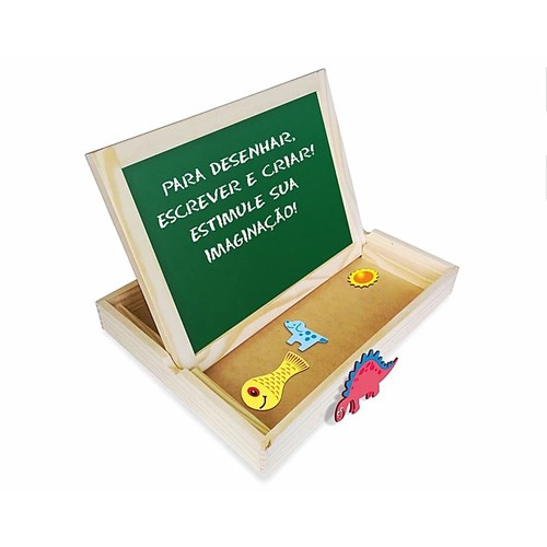 01 caixa de madeira medindo 401mm X 301mm X 50mm, acoplado uma lousa dupla face que se encaixa na caixa para sustentar, 01 lado verde e outro lado branca.