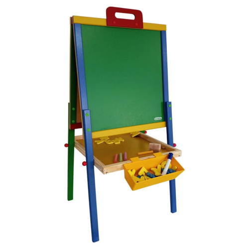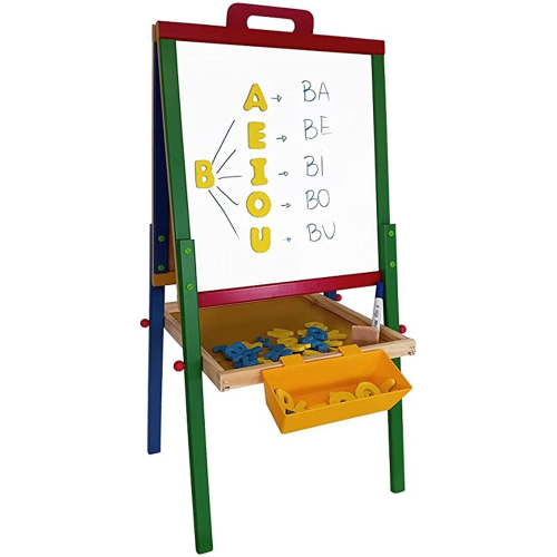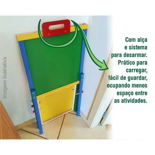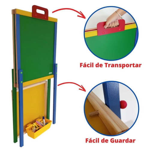 Tem quadro verde para escrever e desenhar com giz escolar, com cesto em plástico para colocar o material didático, quadro branco para escrever e desenhar com marcador podendo também fixar letras em EVA. Com alça e sistema para desarmar. Prático para carregar, fácil de guardar, ocupando menos espaço entre as atividades.