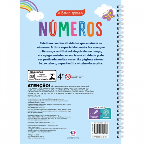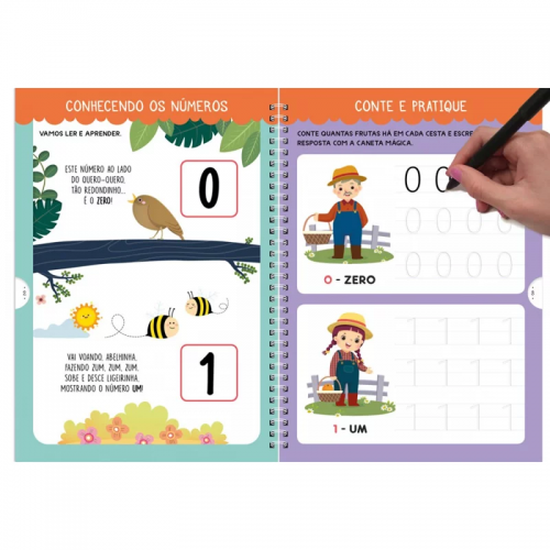 Este livro contém atividades que ensinam os números. A tinta especial da caneta faz com que o livro seja reutilizável: depois de um tempo, ela apaga sozinha, e com isso a atividade pode ser praticada muitas vezes. As páginas são embaixo relevo, o que facilita o treino da escrita.