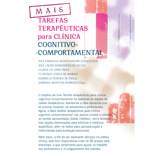 O objetivo do livro Tarefas terapêuticas para clínica cognitivo-comportamental foi sistematizar opções de tarefas terapêuticas, atendendo à demanda que as autoras recebiam de estagiárias e profissionais em atendimentos clínicos. Agora, neste livro, além de serem mais tarefas terapêuticas, estas são direcionadas a públicos mais específicos: há opções de ferramentas para trabalhar com grupos, com pessoas com transtornos especificados e com aquelas em intervenções com objetivos mais delimitados.