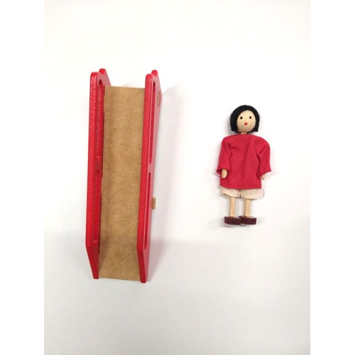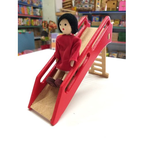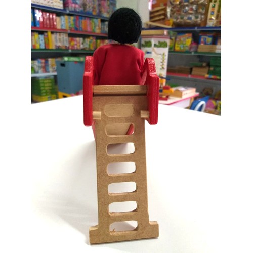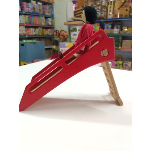 O mini- escorregador é de madeira reciclada, pintado com tinta não tóxica.