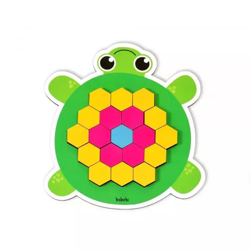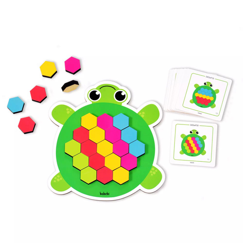 Feito de madeira reflorestada. Contém 1 tabuleiro em formato de tartaruguinha (25x23cm), 60 peças coloridas (3×3,5cm) e 12 fichas com 24 maneiras para reproduzir.
