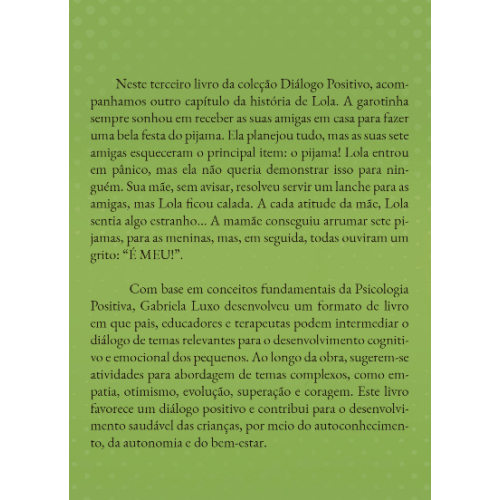 Neste terceiro livro da coleção Diálogo Positivo, acompanhamos outro capítulo da história de Lola. A garotinha sempre sonhou em receber as suas amigas em casa para fazer uma bela festa do pijama. Ela planejou tudo, mas as suas sete amigas esqueceram o principal item: o pijama! Lola entrou em pânico, mas ela não queria demonstrar isso para ninguém. Sua mãe, sem avisar, resolveu servir um lanche para as amigas, mas Lola ficou calada. A cada atitude da mãe, Lola sentia algo estranho...A mamãe conseguiu arrumar sete pijamas, para as meninas, mas, em seguida, todas ouviram um grito: "É MEU!".