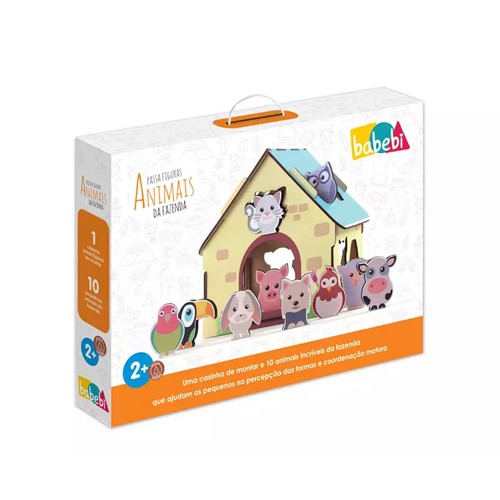 Uma casinha de montar e 10 animais incríveis da fazenda que ajudam os pequenos na percepção das formas e coordenação motora.