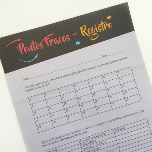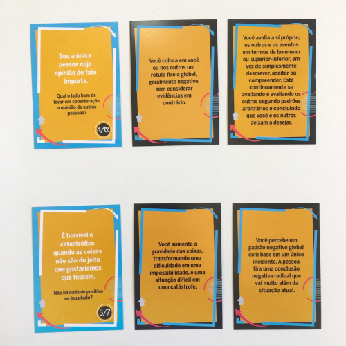 São 35 cartões com afirmações que refletem pensamentos e comportamentos disfuncionais e questões para desconstruir essas regras de forma a promover mudanças na direção desejada, ou seja, construir comportamentos e reações mais assertivas e adaptadas ao contexto atual de vida.