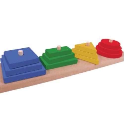 Material de encaixe para reconhecimento e associação de formas geométricas (quadrado, retângulo, triângulo e círculo), além de estimular a coordenação motora fina.