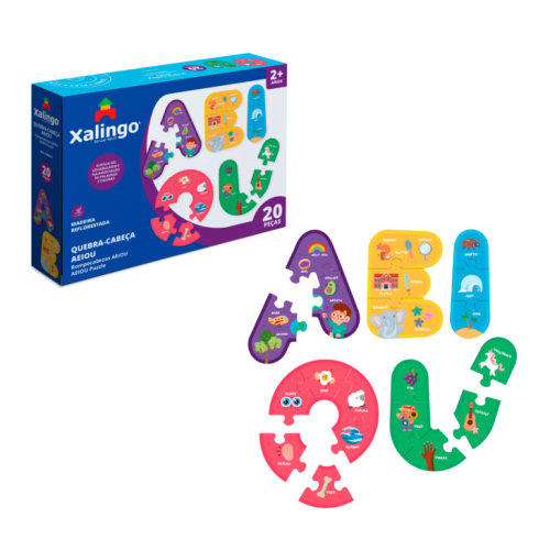 O jogo de quebra-cabeça AEIOU com 20 peças em madeira reflorestada desenvolve a atenção, a discriminação visual, o pensamento lógico e a relação parte/todo, bem como facilita a exploração de temas variados. Além de educativo, auxilia no aprendizado das letras, suas formas e vocabulário. Indicado para crianças a partir dos 2 anos de idade.
