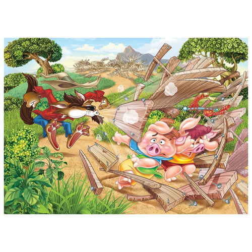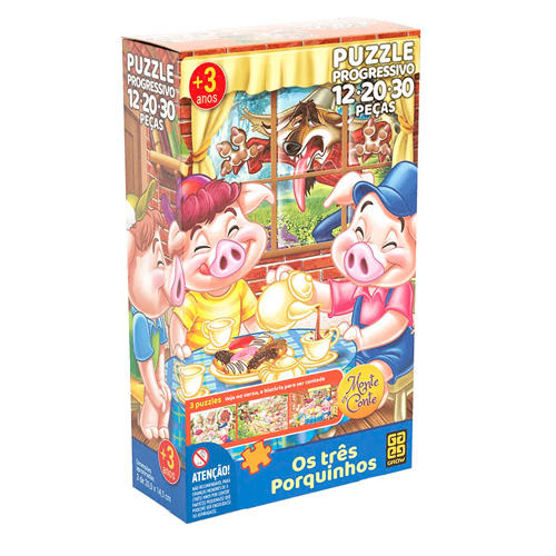 Com 3 quebra-cabeças que contam a história dos Três Porquinhos.
