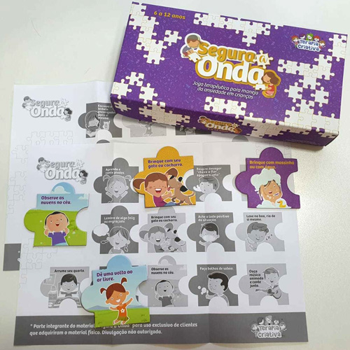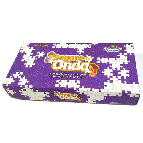 Material lúdico em formato de quebra-cabeças para trabalho com respostas de enfrentamento da ansiedade em crianças. O objetivo é ensinar respostas incompatíveis com a ansiedade, por meio de atividades e ações que promovam descontração, relaxamento, e tirem o foco da situação ou das sensações ansiógenas. Segura a onda é uma expressão popular que na psicoterapia das crianças pode adquirir outros significados, como “respire fundo”, “pense em outras alternativas”, “teste fazer diferente com medo mesmo!”. Segura a onda ajuda a organizar as peças do quebra-cabeças que a ansiedade criou e achar várias saídas possíveis!