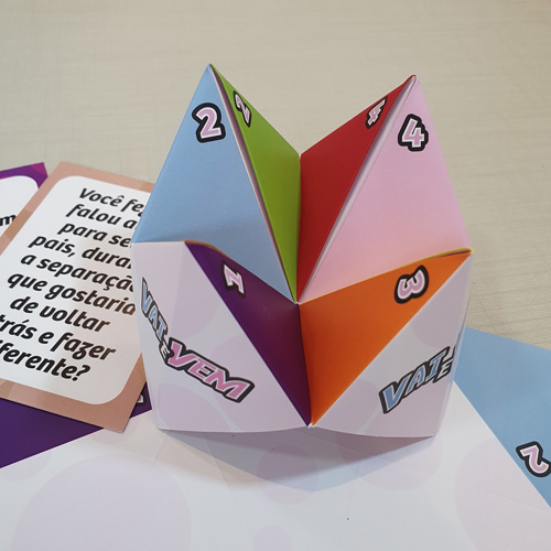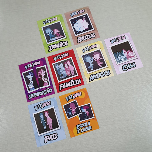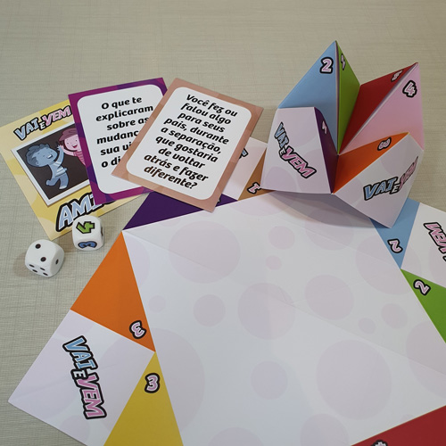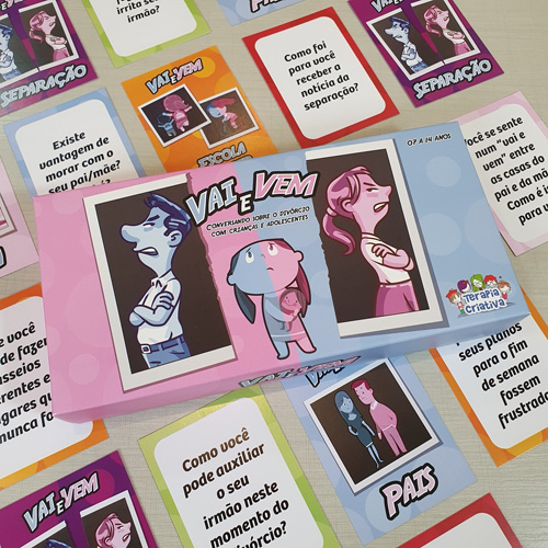 “Vai e Vem” é um jogo com cartas sobre pais, irmãos, brigas, escola, amigos, e família, entre outros assuntos, para promover uma conversa leve sobre as angústias do divórcio com crianças e adolescentes, enquanto você terapeuta reúne as informações necessárias para ajudá-las a encontrar um significado para as mudanças que estão vivendo.